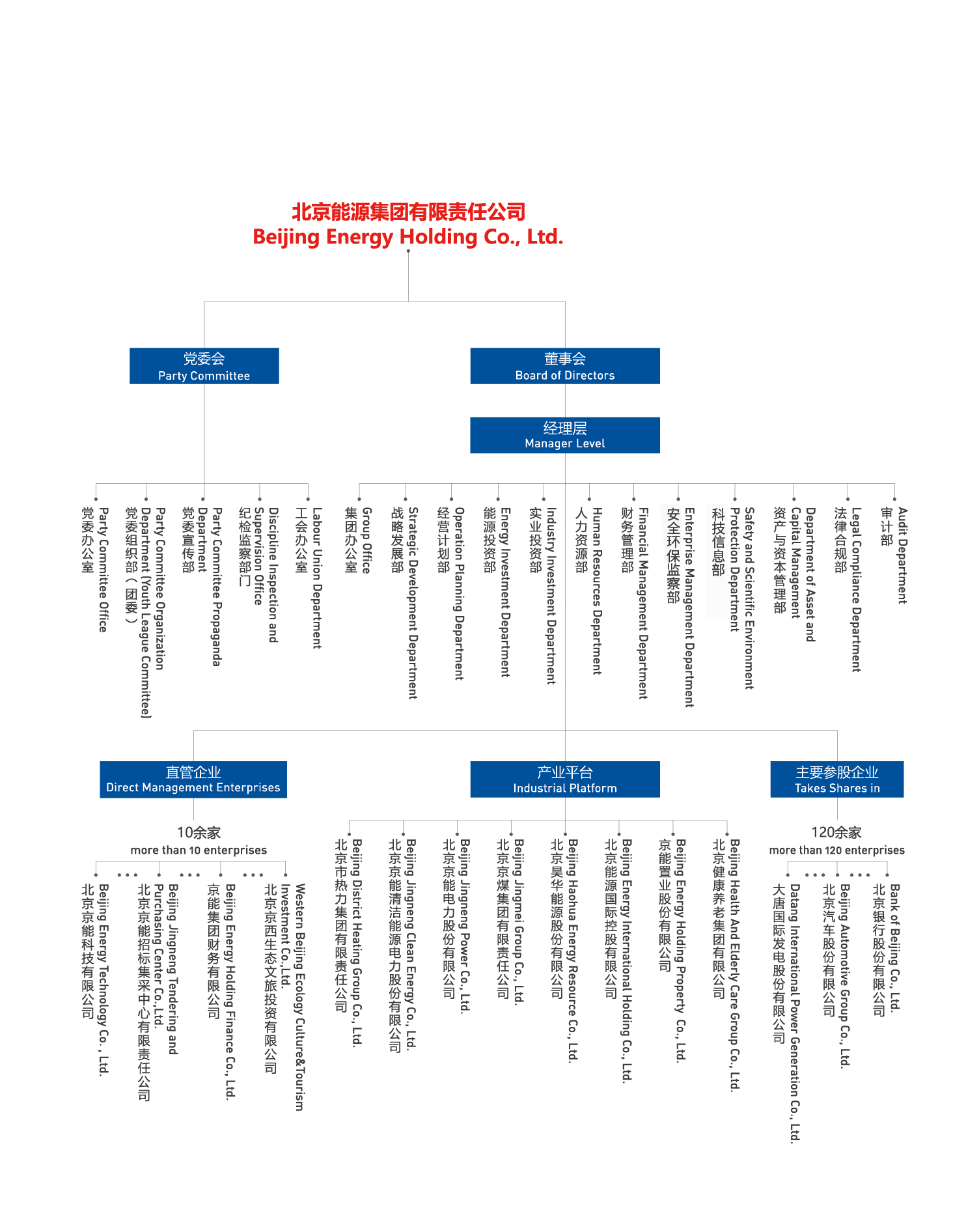 北京能源集團有限責任公司(以下簡稱“京能集團”或“集團”)是北京市人民政府出資設立的國有獨資公司,肩負著保障首都北京能源安全可靠供應的重任。集團成立于2004年,由原北京國際電力開發(fā)投資公司和原北京市綜合投資公司合并而成,2011年、2014年先后又與北京市熱力集團有限責任公司、北京京煤集團有限責任公司實施合并重組,實現了產業鏈條融合互補。經過多年的資源整合,集團由單一能源產業發(fā)展為熱力、電力、煤炭、健康文旅等多業態(tài)產業格局。2024年底,集團資產規(guī)模達4934億元,年營業收入975億元,全資及控股企業860余家,參股企業120余家,擁有員工3.4萬余人,投資區域遍布全國33個省市區以及海外,控股京能清潔能源、京能電力、昊華能源、京能置業、北京能源國際、京能熱力六家上市公司,盈利水平長期穩(wěn)居北京市屬企業前列。2024年在中國企業500強排名第247位,中國服務企業500強排名第87位。